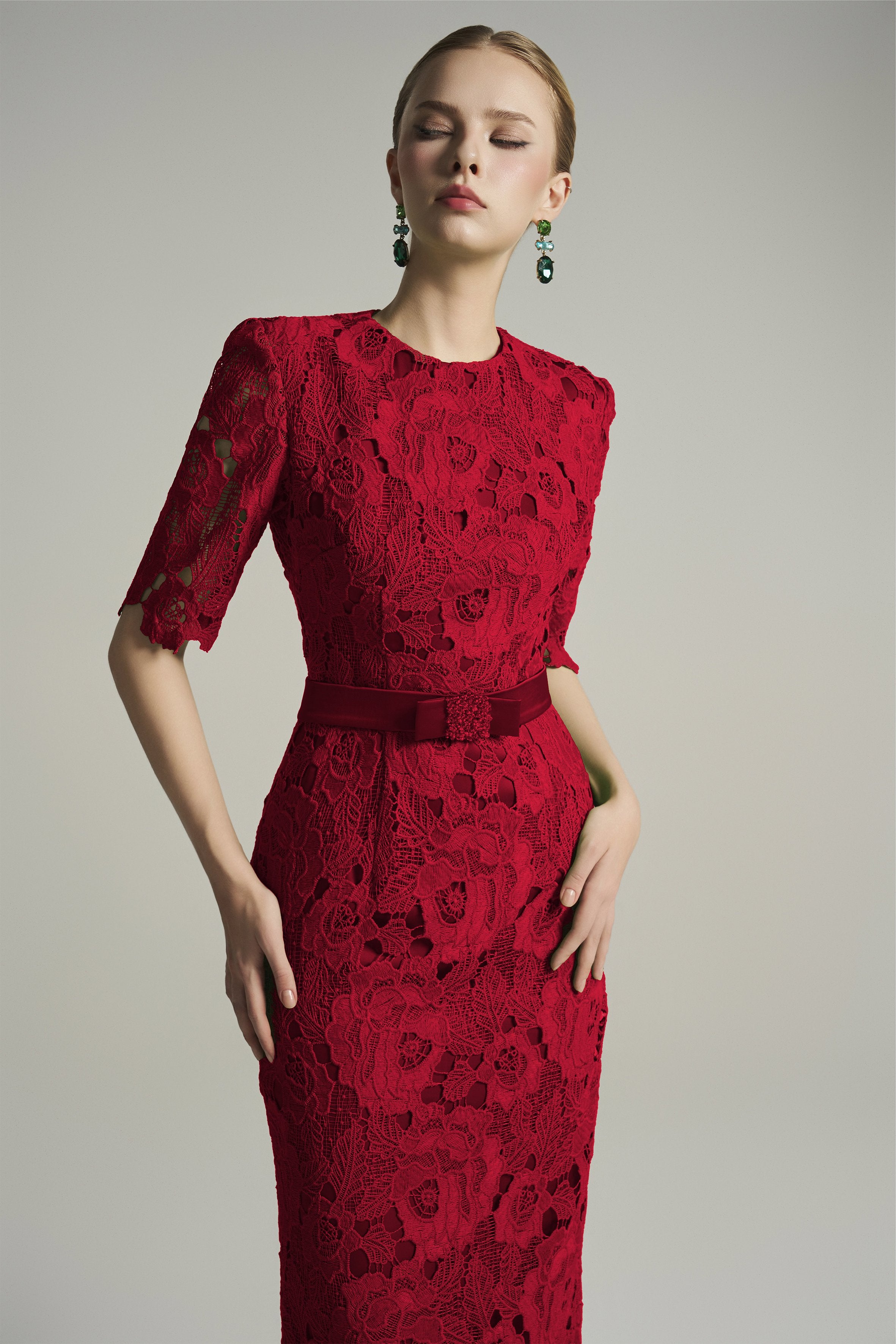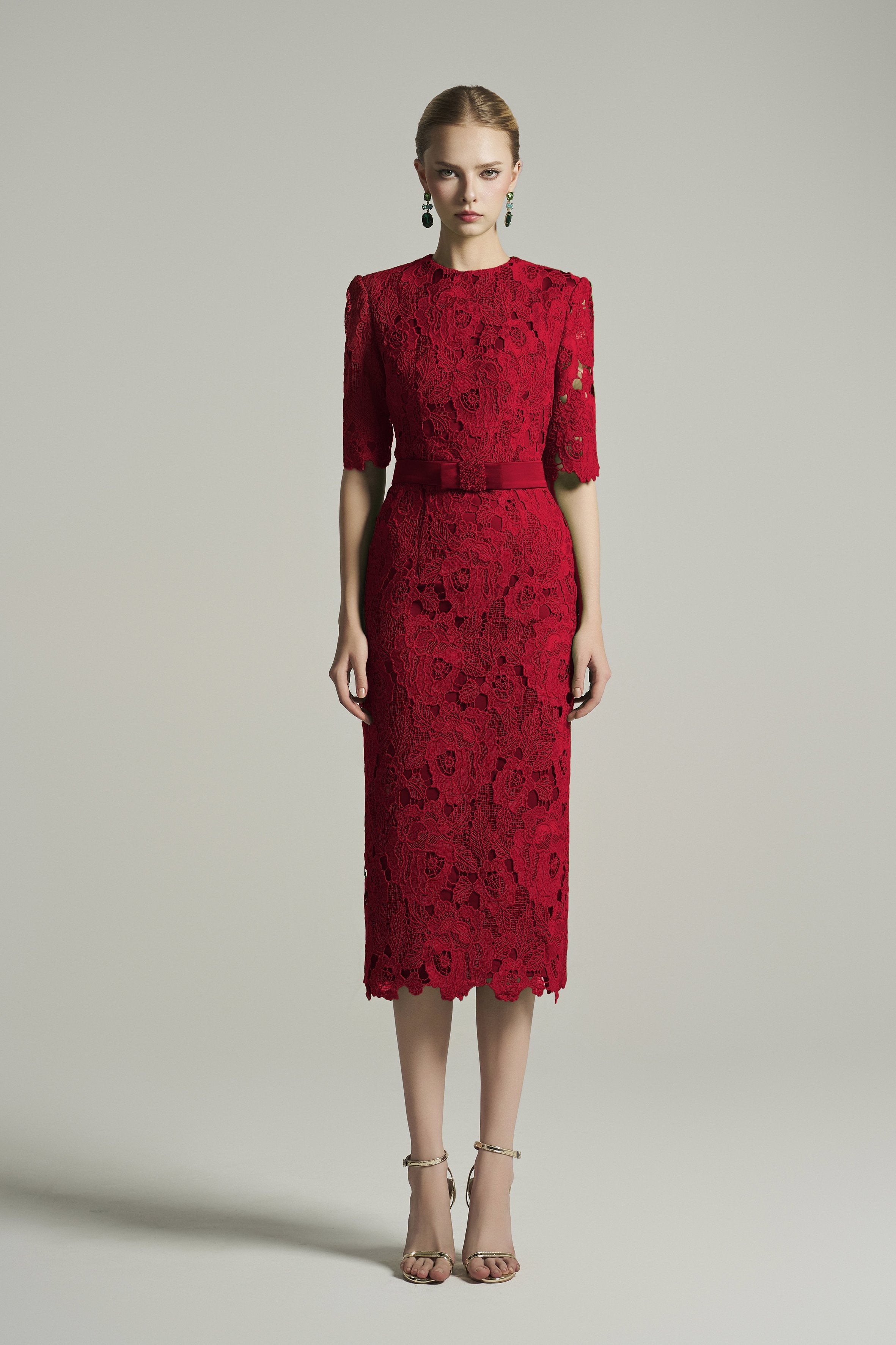 Elevate your style with this elegant dark red midi lace dress. Handcrafted floral lace details add subtle sophistication to the bodycon silhouette, while the timeless dark red hue enhances its classic beauty. A beaded bow belt accentuates the waist, giving the wearer a regal, feminine allure.