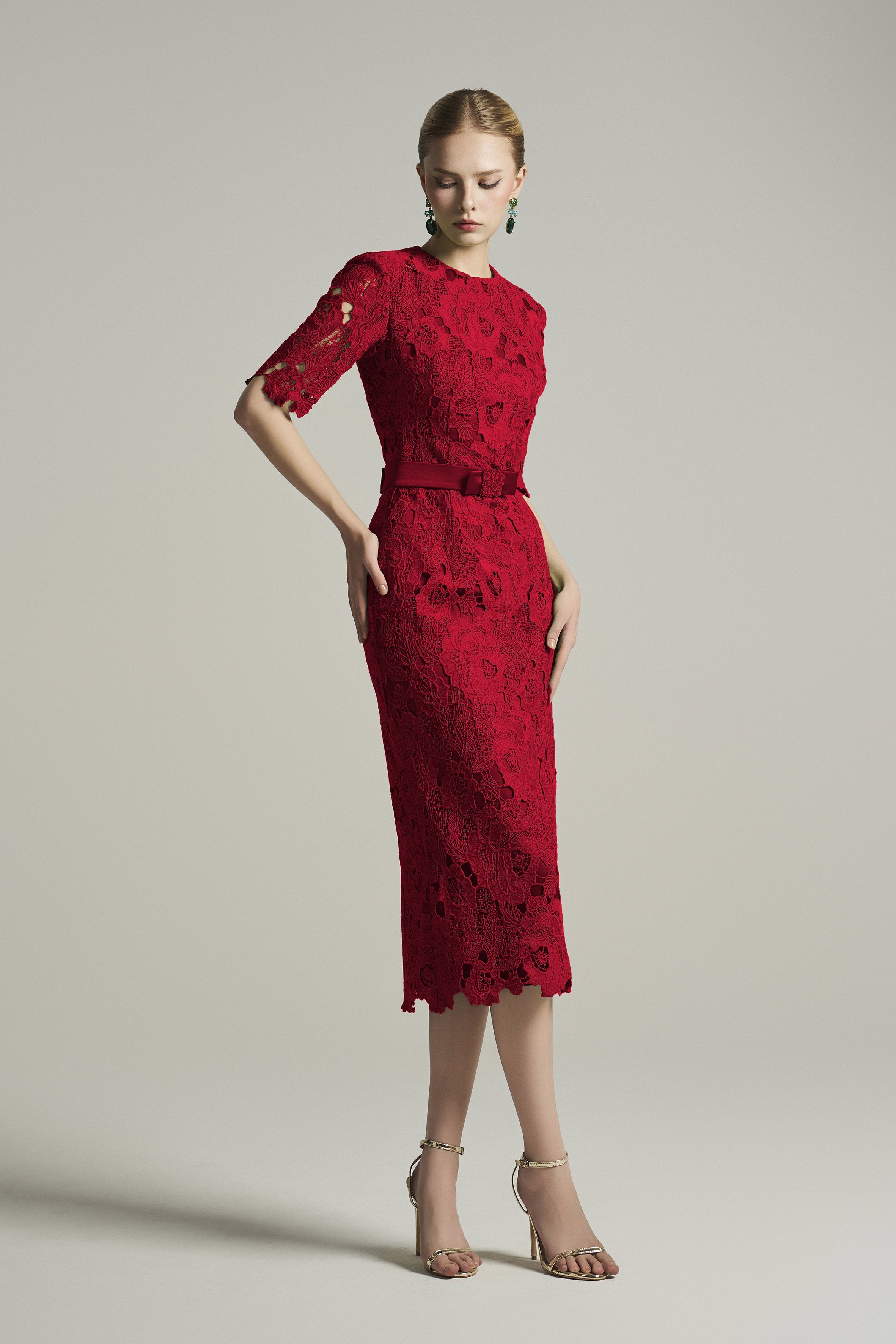 Midi Lace Dress With Crystal Bow Belt