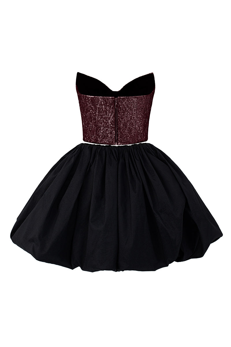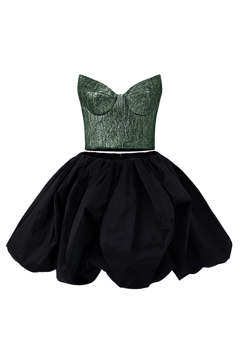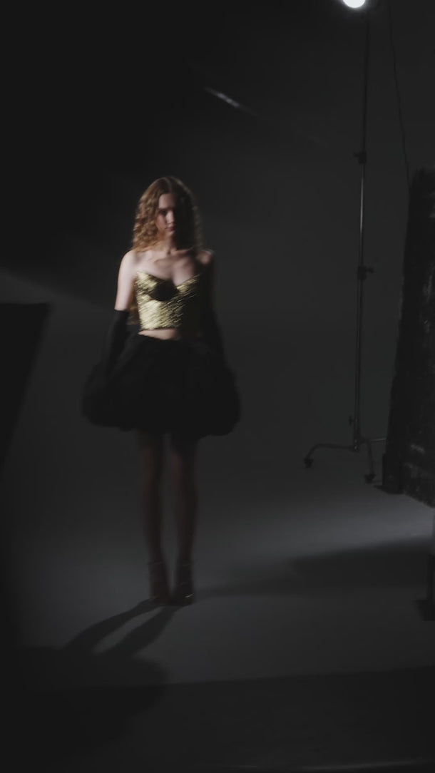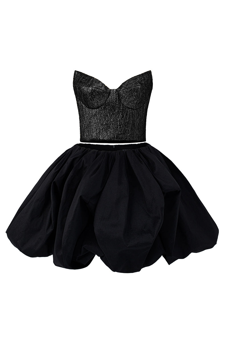 Gold Metallic-Lacquer Jacquard Bustier Crop Top & Black Taffeta Bubble Mini Skirt Set