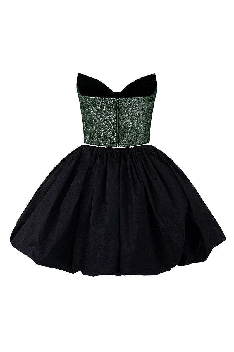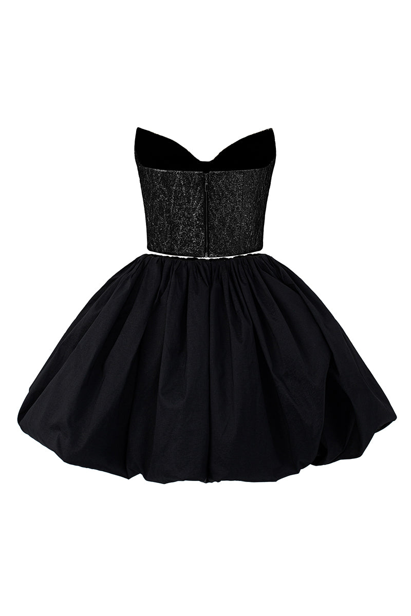 The Gold Metallic-Lacquer Jacquard Bustier Crop Top glows with sculpted modernity. Crafted from lacquered gold jacquard, the piece reflects light with a molten, luminous sheen. Lotus-petal shaped detailing adds soft architectural dimension, balancing the sharp bustier lines with fluid, floral-inspired curves. Match perfectly with the Black Taffeta Bubble Mini Skirt fuses structure with movement. Crafted from lustrous taffeta, the bubble silhouette adds a playful volume, while smocked detailing at the waist provides a flattering, tailored fit. A chic balance of youthful energy and refined texture