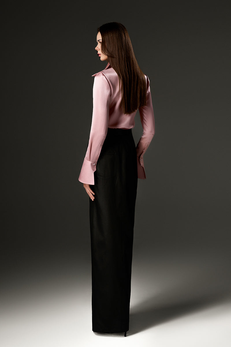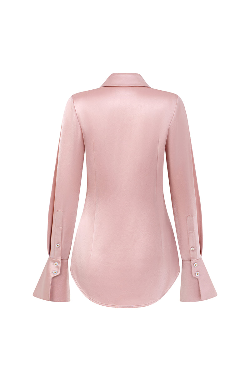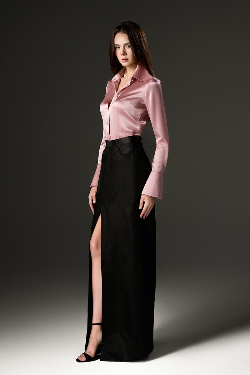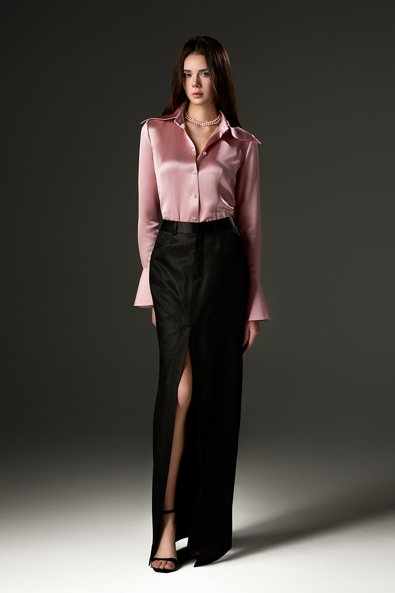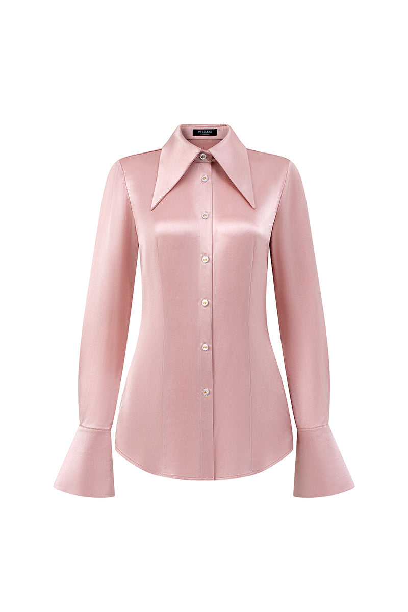 The Pink Satin Silk Slim-Fit Shirt fuses sleek tailoring with subtle femininity. Cut close to the body, the shirt drapes with the soft, lustrous fluidity of satin silk, while oversized statement cuffs add a bold, architectural accent. A perfect balance of modern sophistication and delicate luxury