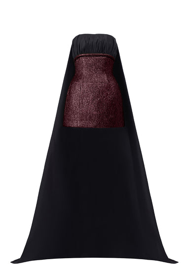 Crafted in shimmering metallic-lacquer jacquard, this bustier mini column dress stands as a fusion of artistry and allure. The gold-patterned fabric is balanced by a refined black bodice, creating a striking interplay of texture and tone. A sweeping extended train trails gracefully behind, transforming the modern mini length into a couture-inspired silhouette made for the spotlight
