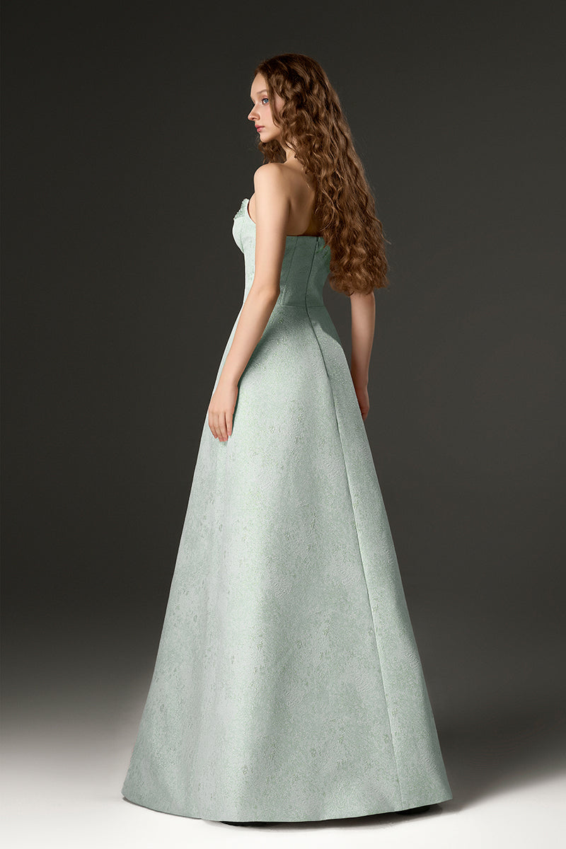 Light Green Lacquered Brocade Bustier A-line Dress with Lotus-Petal Shaped Detailing